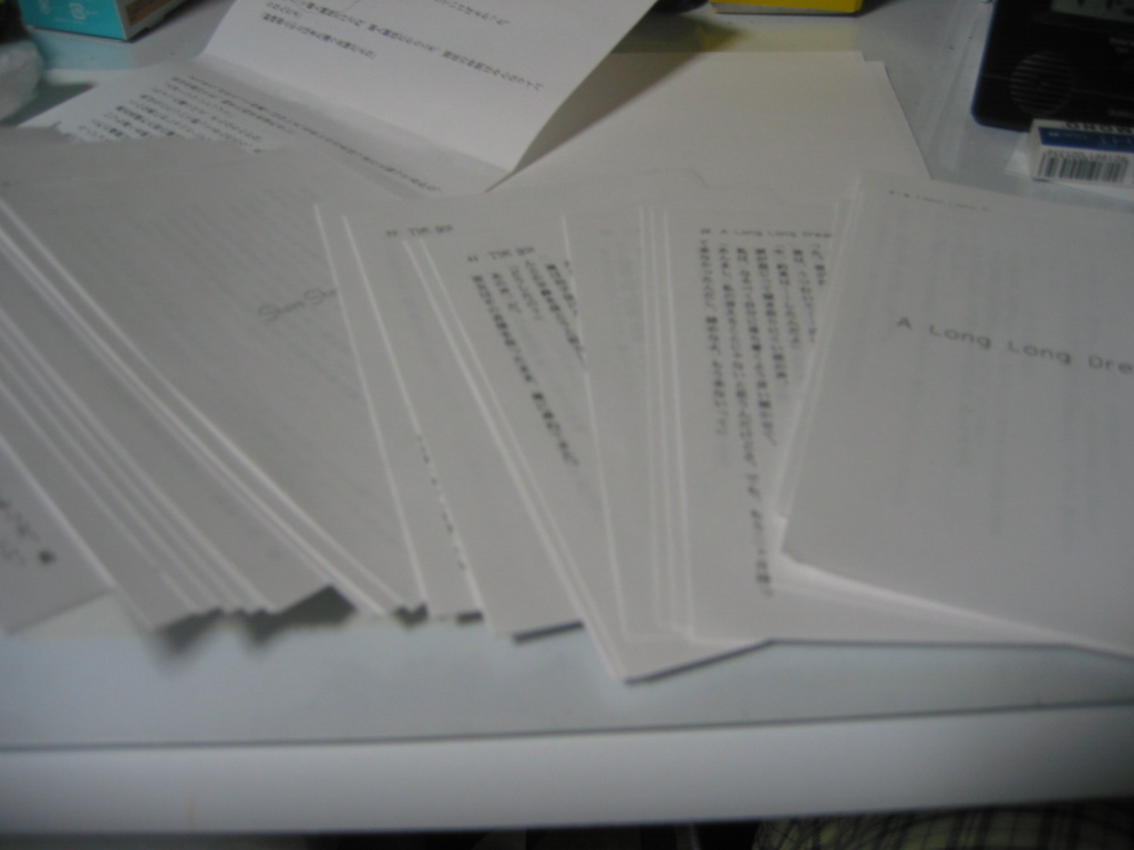 次に、印刷。最初B5の紙を見開きページとして印刷していたのだが、B5は縦目の紙のため、綴じるとページが横目になって非常に読みにくくなる。最初仕方がないかとしていたのだが、印刷途中に、文庫本がA6サイズという大発見をしたため、急遽変更。A4を半分に切断すると、横目のA5の完成。これに印刷する。まず、切るのが大変。だって、ページ数230ページだから。プリンタの発展のおかげで、印刷はスムーズに終了。大量のミスプリを排出したけど、まぁ成功。