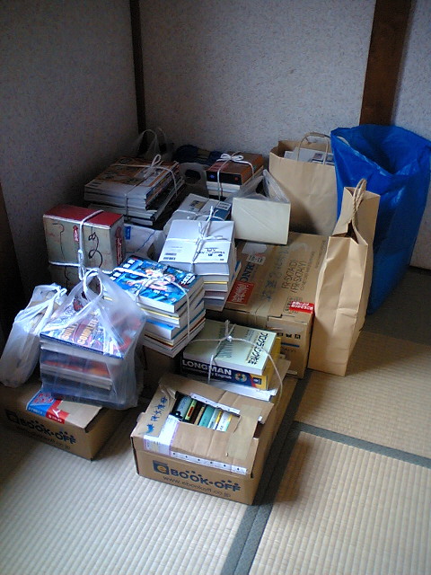 本が多い。袋詰めしてそう思った。自分であきれるほどに。写真は、段ボールやら袋に詰められた本を積んで見た様子。開けて、必要そうな本だけを本棚に並べてみるとみると意外と少ない。既読本は極力段ボールに収納して押し入れへ。