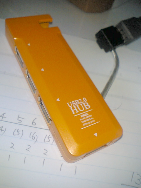 携帯で撮った写真を取り込むのも、USBアダプターを使えばできる。しかし、それを差すべきUSBポートは、なんと、パソコンの裏か、パソコンの下の方にしかない。これは非常に利便性が悪い。と言うことで、100円ショップで1mのUSB延長コードを、USBハブ(USB1本をUSB4本に変換するたこ足装置)をヤマ電で1400円で購入し、机の上にUSBの穴を設置することに成功した。